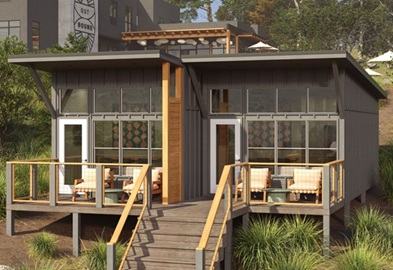 The resort includes 104 cabins and 14 lodge-style rooms, an expansive pool, hot tub, and over 5,000 square feet of flexible indoor-outdoor meeting space. Cabins are arranged along the natural slope to maximize views, with layouts designed for couples, families, and groups. Select units feature outdoor showers, and a flagship suite includes an efficient kitchen, indoor lounge, and oversized deck ideal for small gatherings.